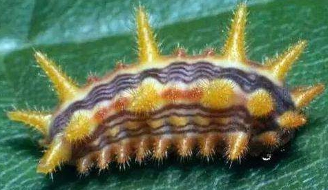 幼虫:老熟时体长为8〜10mm,宽为5〜7mm。近椭圆形,龟状,翠绿色,体表光滑,略角质化,无刺突与刺毛,有金黄色纹,亚背线黄色,背线与侧线处每节各具1暗色斑点,前胸红褐色,中胸背板深褐色,其上具淡黄色斑点6个,间或背腹中部数节亚背线处有红点2〜4对。